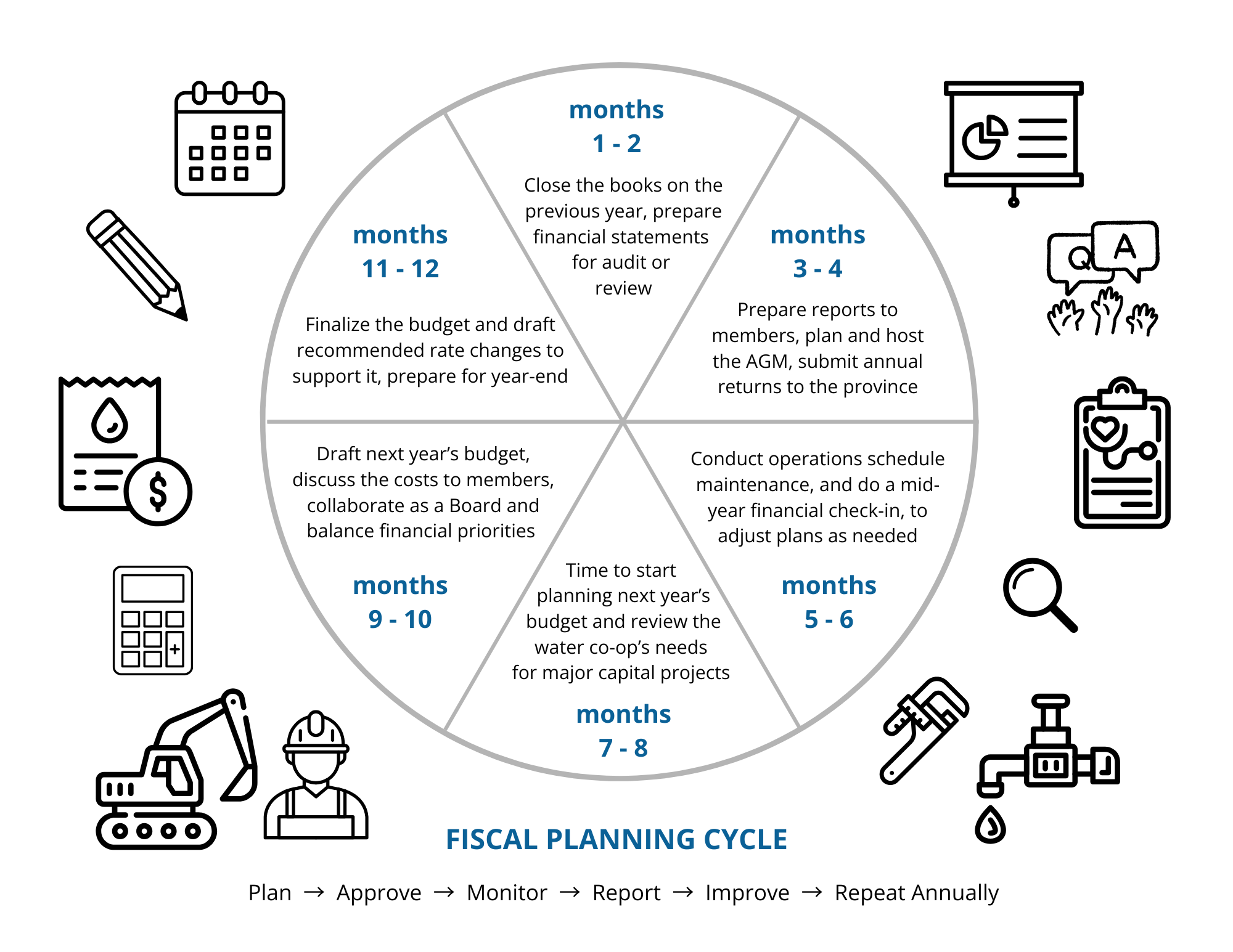 It takes steady rhythm to run a financially healthy water co-op. The cycle is simple: The Board will move through planning, tracking and reporting responsibilities.