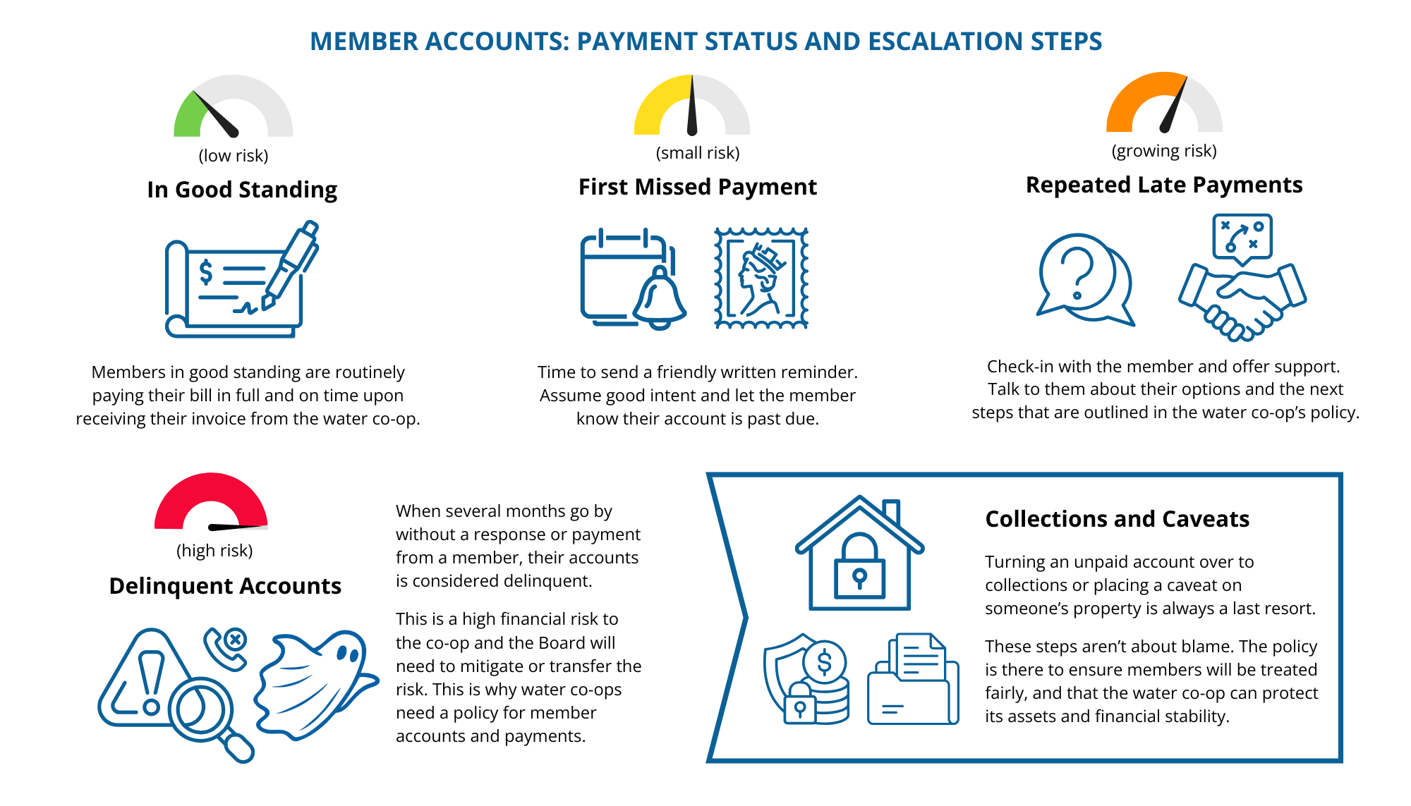 | Delinquent | 120+ days | At this stage, the water co-op must take action to protect its financial stability. The Board reviews the steps taken (following the policy framework) to reach the member and work with them on a solution, and then determines if the file should be transferred to collections, if the co-op should seek legal counsel, or if a caveat will be filed. |